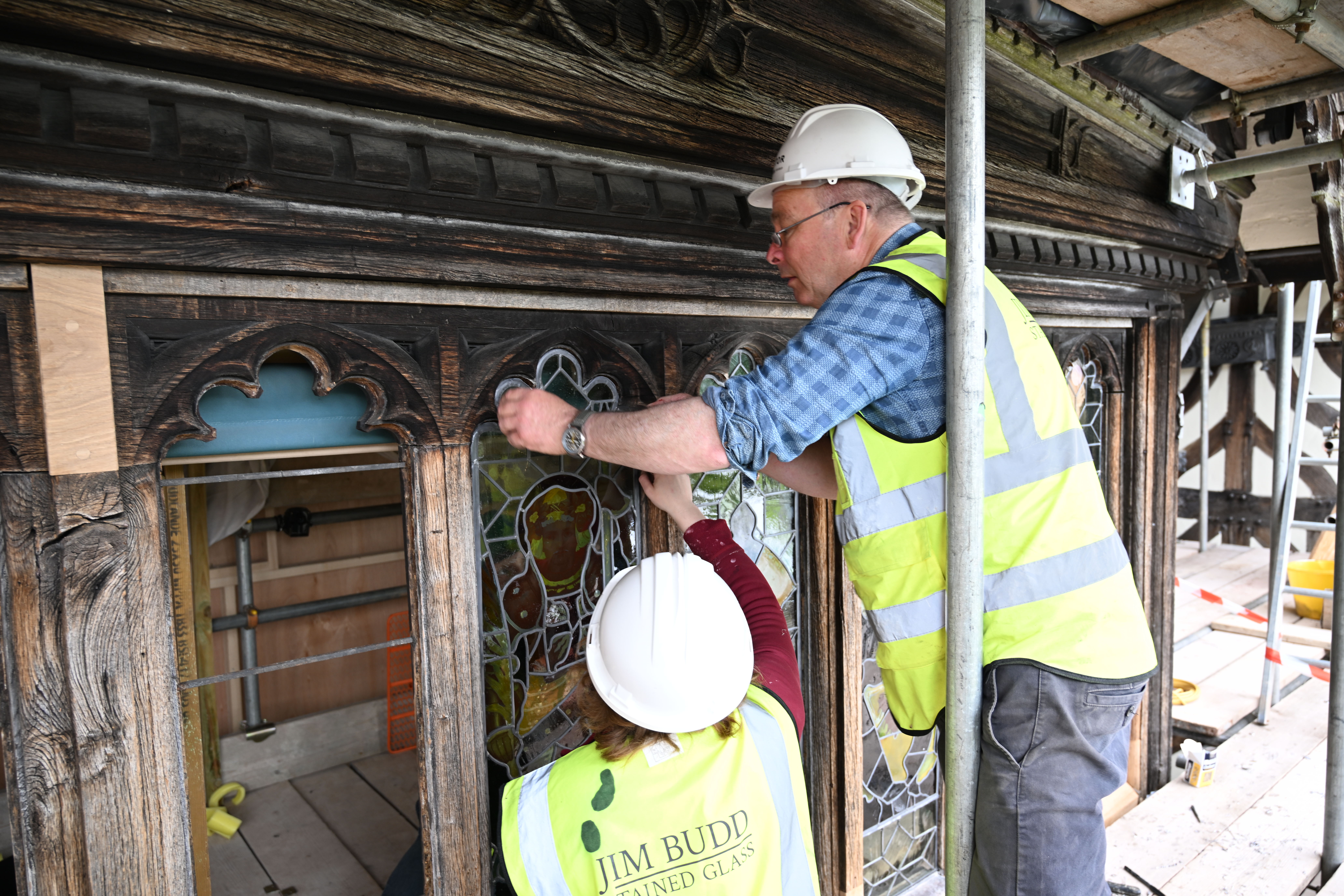 Reinstalling stained glass during the restoration at Wightwick Manor. Photos: Rachael Parry & Lindsey Bucknor