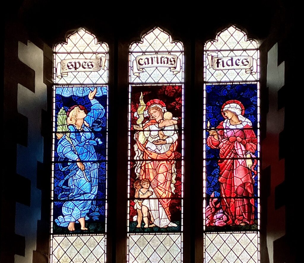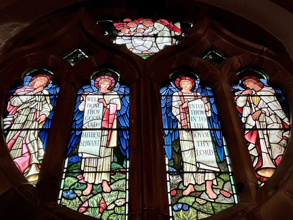 The church has an altar panel by Byam Shaw and altar carpet to a Morris design. The stained glass is by Morris & Co, mostly to Edward Burne-Jones’s designs. The east window has 15 subjects as a memorial to Charles Howard from 1880 with angels, saints, the Good Shepherd and pelican, mostly with totally original designs, whilst the side windows are re-used designs.