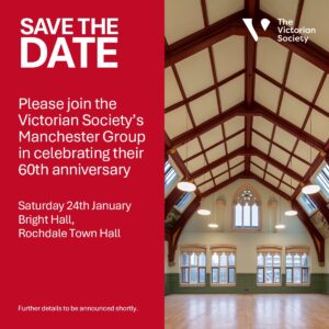 We invite you to join the Victorian Society’s Manchester Group in celebrating their 60th anniversary. This celebration day will include a series of talks on Rochdale Town Hall’s recent restoration followed by lunch and tours of the building and its setting. Detailed information to follow. Reserve the date now!